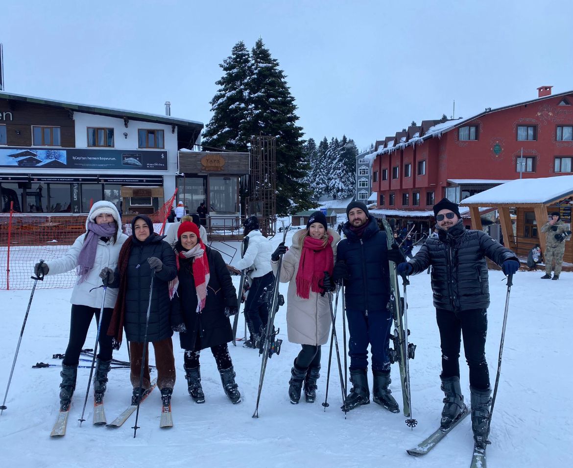 Rehberimizden indirimli kayak ekipmanları, kayak kıyafetleri ve sucuk–ekmek hakkında bilgilendirme aldıktan sonra Uludağ’daki kayak keyfimiz başlıyor.